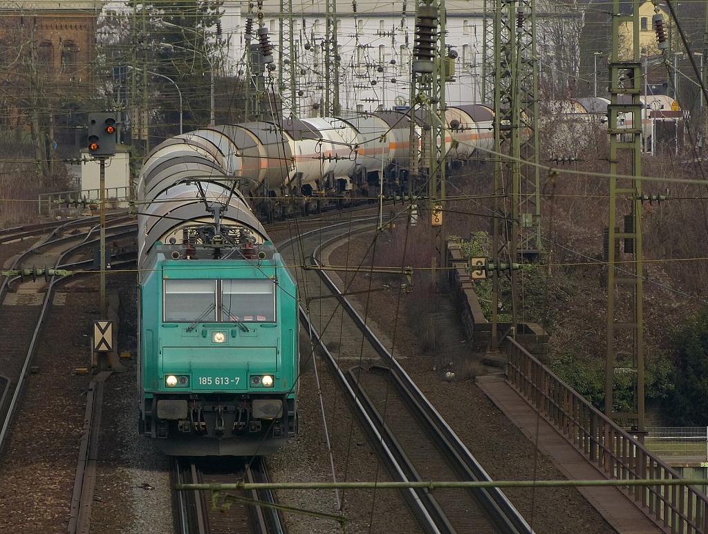 185 613-7 hat mit einem Kesselwagenzug den Bahnhof Koblenz-Lützel durchfahren und befährt nun die Moselbrücke.20.2.12