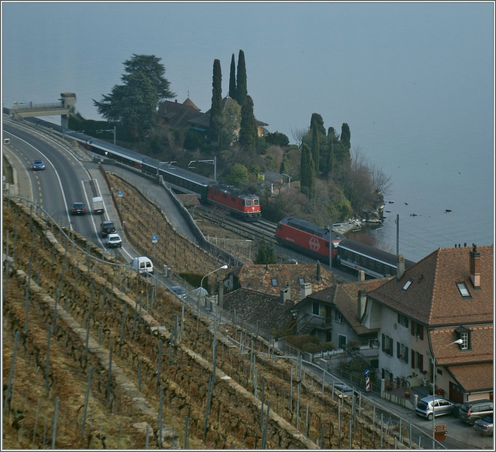 Der IR 1735 mit einer Re 460 begegnet bei St-Saphorin dem IR 1728 von Brig nach Genève Aéroport, welcher von einer Re 4/4 II gezogen wird.