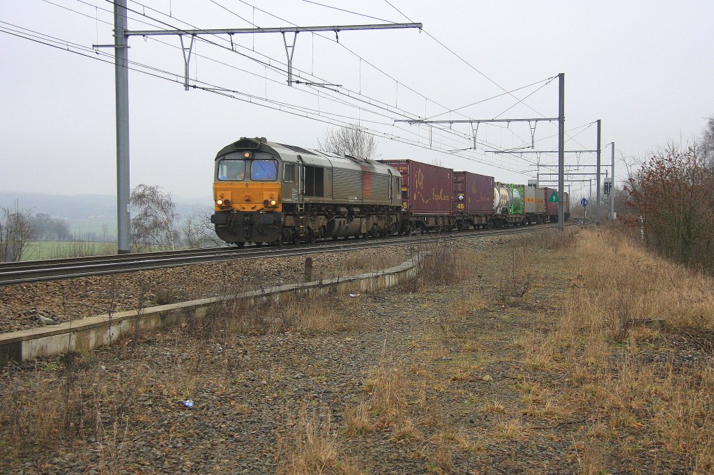 Die Class 66 DE6309 von DLC Railways kommt mit einem Containerzug aus Aachen-West und fährt durch Montzen-Gare(B) und weiter in Richtung Vise(B) bei Nieselregen am 28.2.2012.