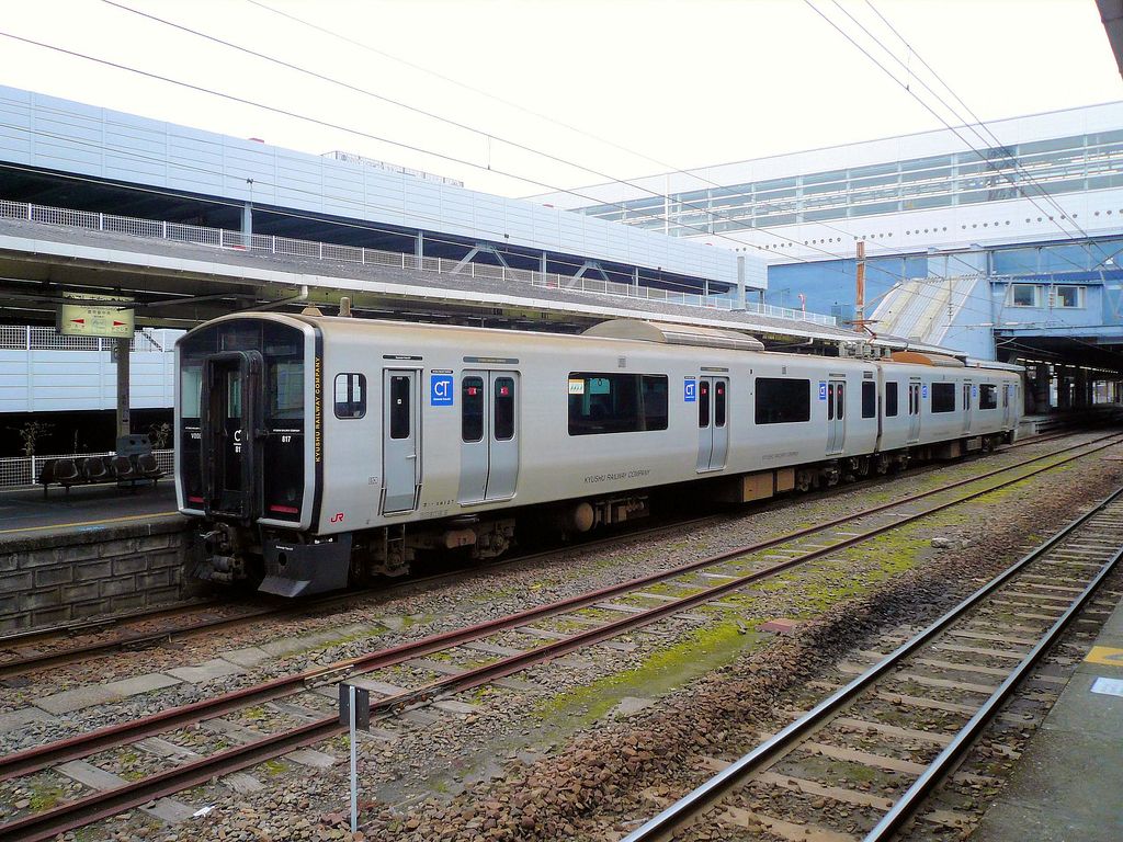 Serie 817: Standard-Wechselstromtriebwagenzug (20 kV/60 Hz; 120 km/h) für Japans Südinsel Kyûshû. Die Züge bestehen aus einem motorisierten Endwagen (KUMOHA 817) und einem Steuerwagen (KUHA 816). Bis jetzt sind zwischen 2001 und 2007 49 Wagenpaare gebaut worden; ein Teil der Züge wird jetzt zu 3-Wagenzügen verlängert. Sie weisen einen innovativ gestalteten Innenraum mit leichten gepolsterten Quersitzen auf. Im Bild Zug Nr. 8 (KUMOHA 817-8 + KUHA 816-8) in Kagoshima, 30.November 2010.