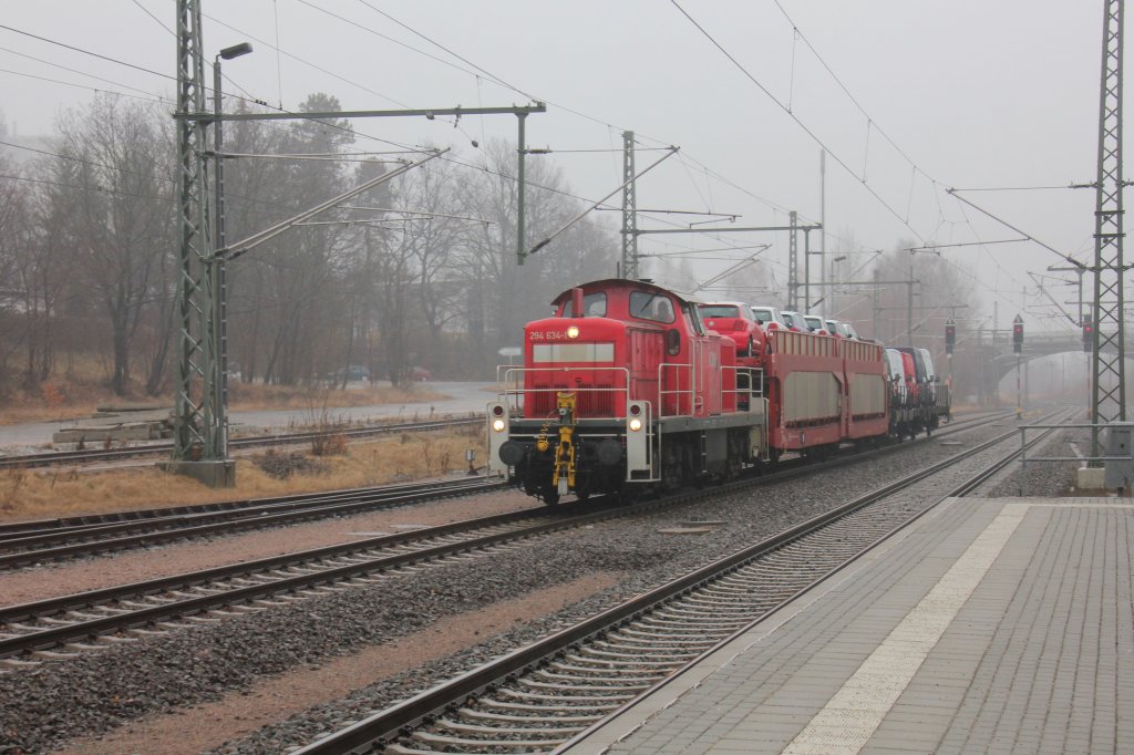 294 634 mit kurzen Autozug am Haken am 29.02.2012 in Neumark(Sachs.).