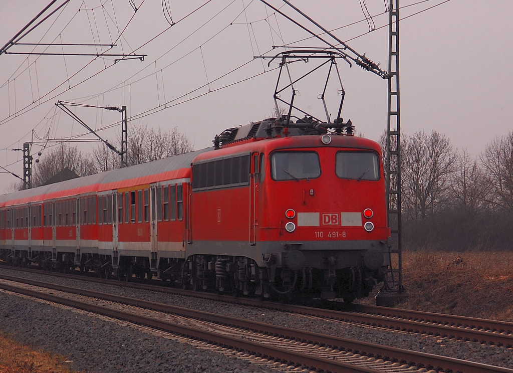 Nachschub durch die 110 491-8 erhält der RE 4 Verstärker an diesem Mittwoch den 29. Februar 2012. als ich den Zug bei Korschenbroich abgelichtet habe.