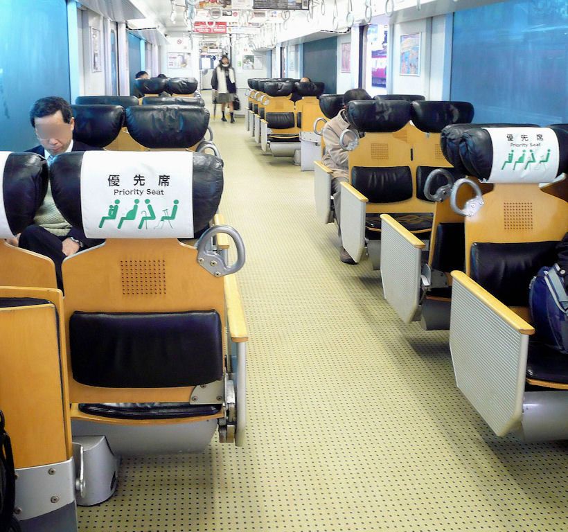 Serie 817: Das Innere dieser Züge für den Regionalverkehr auf der Insel Kyûshû ist originell und ansprechend - der Boden in einer erstaunlichen gelben Farbe, dazu ein geräumiges Inneres mit zweckmässigen und bequemen Quersitzen mit umlegbaren Rückenlehnen für Fahrten über mittlere Distanzen. Blick in den Zug Nr.8. 1.Dezember 2010.
