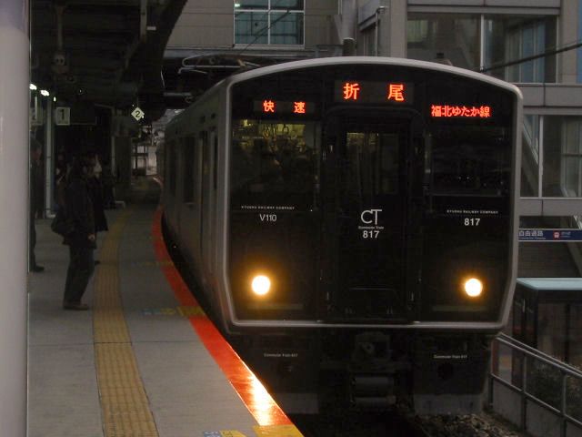 Serie 817: Die schwarze, glänzende Stirnfront gibt diesen Zügen einen unverwechselbaren Charakter. Am Abend oder bei Regen kann dies allerdings etwas düster wirken. Zug Nr.110 (Frontwagen KUMOHA 817-1010), einer der für den S-Bahnverkehr um Fukuoka herum eingesetzten Züge, in Chôjabaru (Nord-Kyûshû), 16.März 2007.
