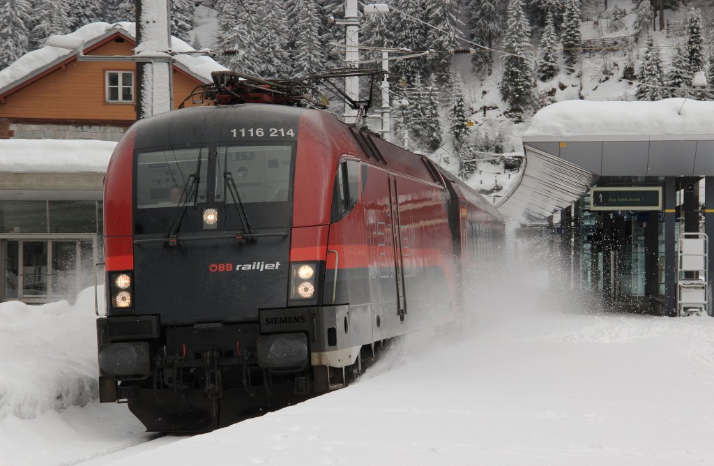 1116 214 fährt am 04.01.12 mit einem Railjet aus Wien nach Bregenz durch den Bahnhof Langen am Arlberg.