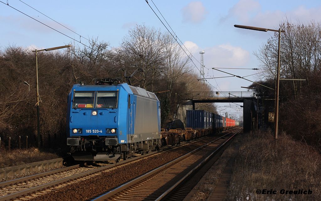 185 520 mit einem Containerzug am 04.02.2012 in Ahlten.