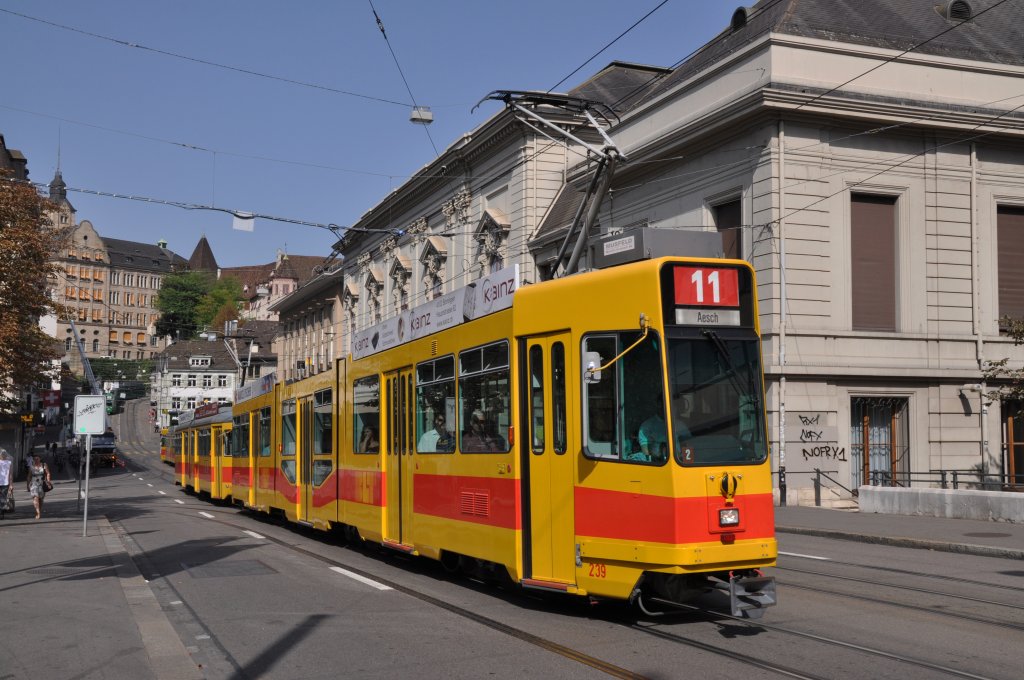 Be 4/8 mit der Betriebsnummer 239 und der Be 4/6 109 auf der Linie 11 fahren den Steinenberg hinauf zur Haltestelle Bankverein. Die Aufnahme stammt vom 22.08.2011.