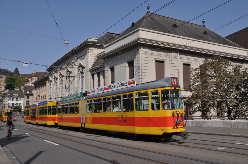 Be 4/8 mit der Betriebsnummer 259 und der Be 4/6 113 auf der Linie 11 fahren den Steinenberg hinunter zur Haltestelle Barfüsserplatz. Der Anhänge-Motorwagen 113 war an einem schweren Unfall in Münchenstein mit Entgleisung beteiligt. Dabei wurde der Wagen so sehr beschädigt, dass er abgebrochen werden musste. Die Aufnahme stammt vom 22.08.2011.