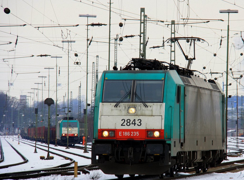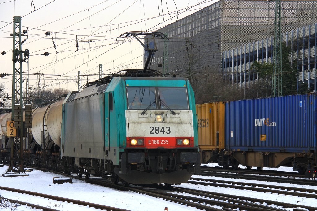 Bei eisigen Temperaturen und Schnee kommt die Cobra 2843 mit einem Kesselzug aus Belgien und fährt in Aachen-West ein am 3.2.2012.