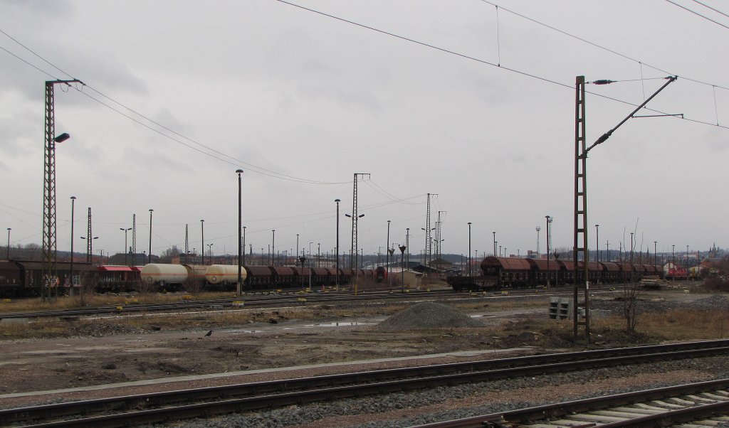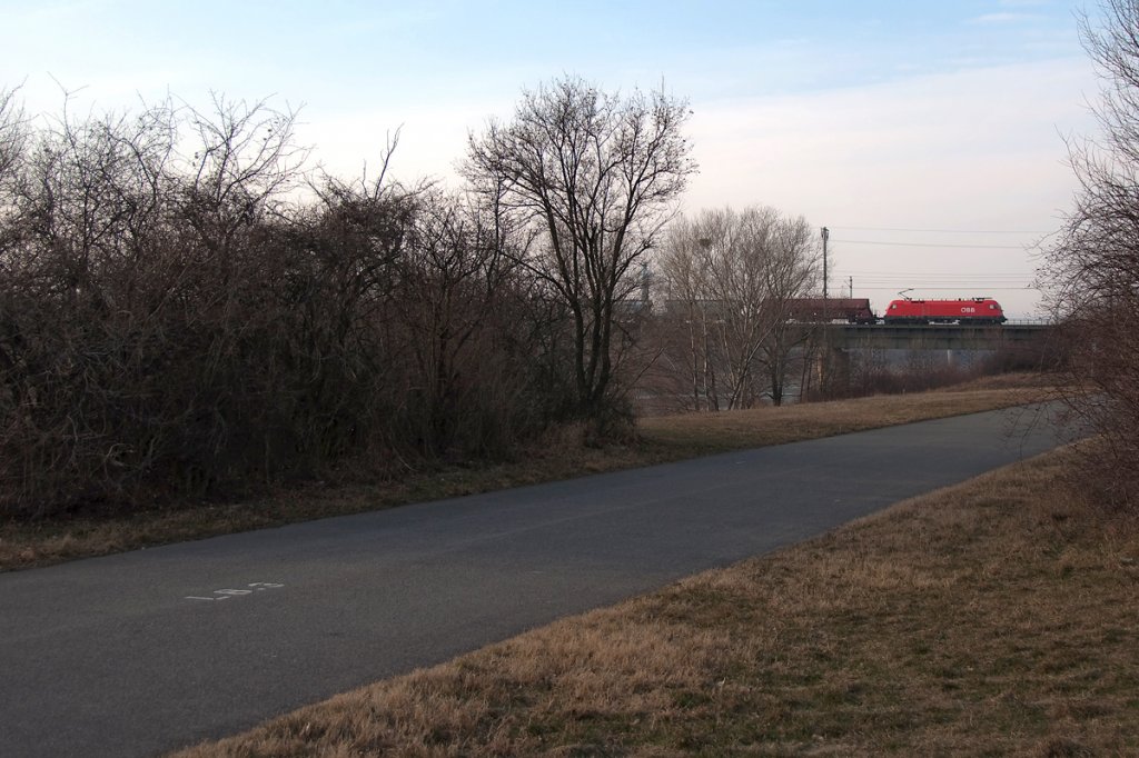Bei Km 8,3 der Wr. Donauinsel hat dieser Güterzug bereits die Donau und das Entlastungsgerinne in Wien überquert und ist weiter Richtung Norden unterwegs. Die Aufnahme entstand am 03.02.2012 kurz vor der Haltestelle Wien Lobau.