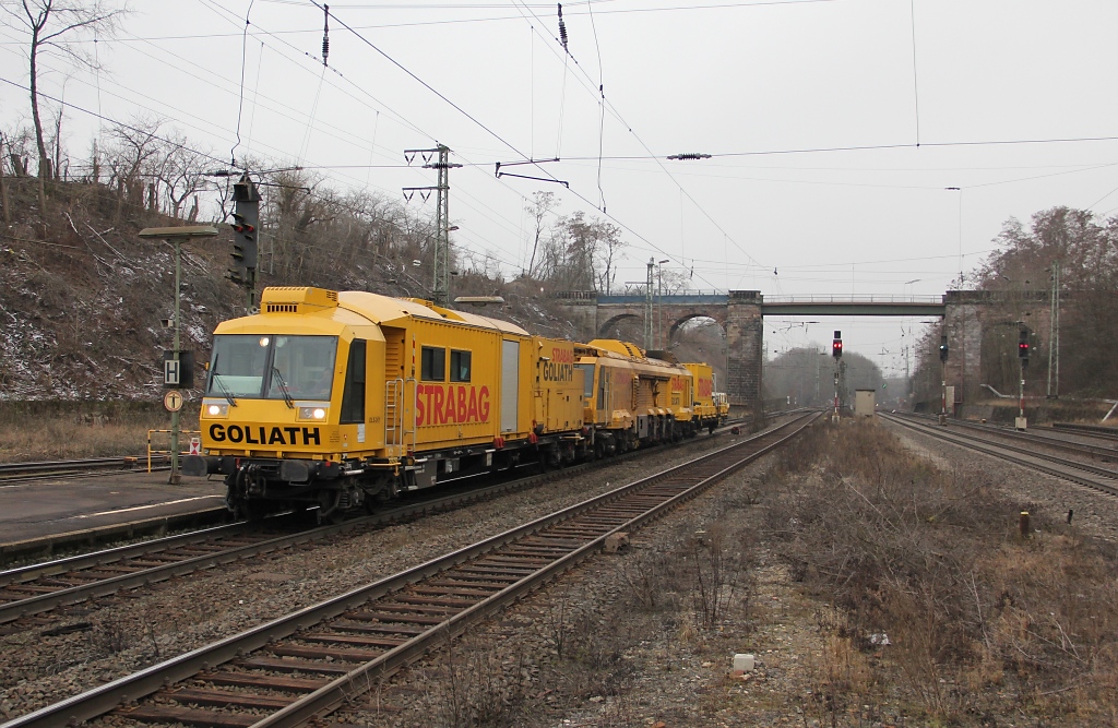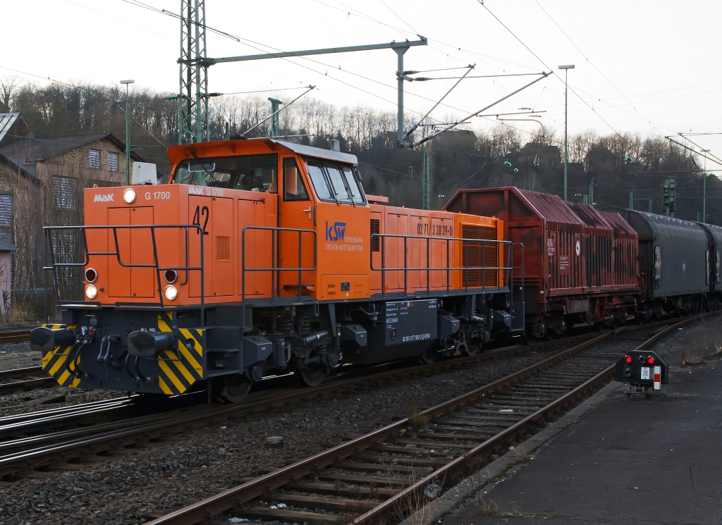 Kreisbahn Siegen-Wittgenstein  (KSW) mit Lok 42, eine Vossloh G 1700 BB (F.-Nr. 1001108, Baujahr 2001) fährt am 04.02.2012 mit beladenen Coil-Güterzug von Betzdorf/Sieg in Richtung Herdorf.