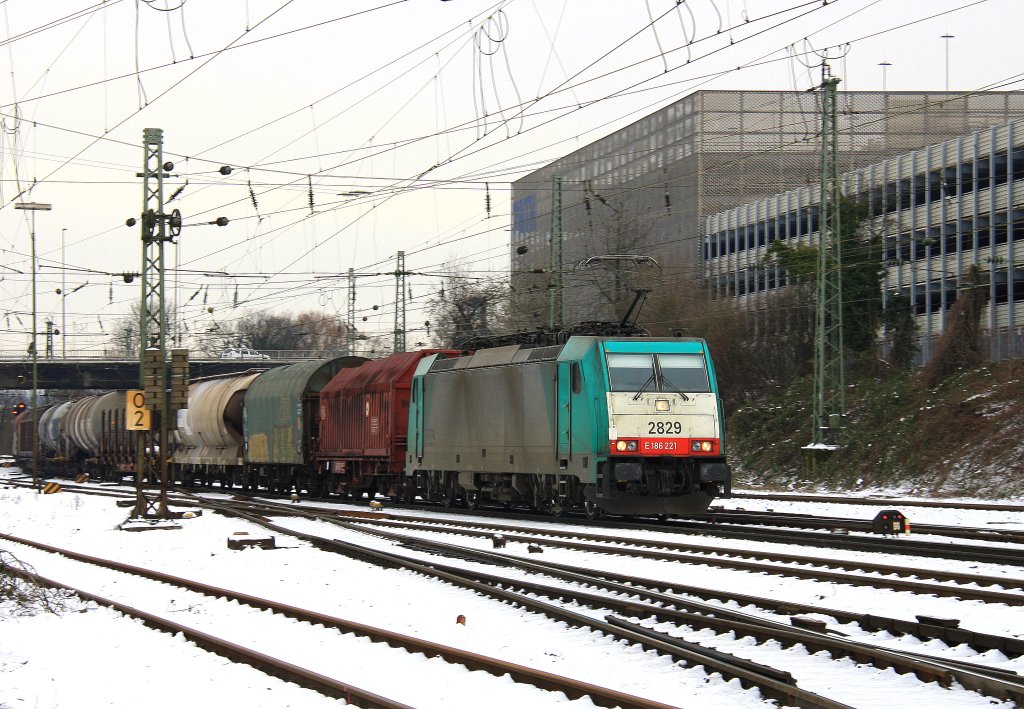 Die Cobra 2829  kommt bei Schnee mit einem gemischten Güterzug aus Antwerpen-Noord nach Köln-Gremberg und fährt in Aachen-West ein am 3.2.2012.
