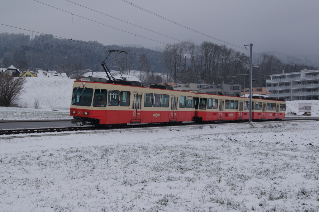 Ein Pendelzug bestehend aus dem Bt 201 und dem Be 8/8 27/28 erreicht am 31.1.12 Emmat.