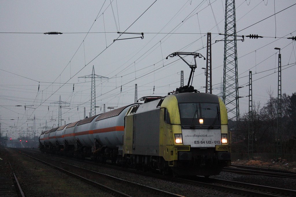 ES 64 U2-012 (i.E. für TXL) am 30.1.12 mit dem in dieser Woche +330 Minuten verspäteten DGS 48815 Moers Gbf-San Giovanni Valdarno bei bei der Durchfahrt durch Ratingen-Lintorf.