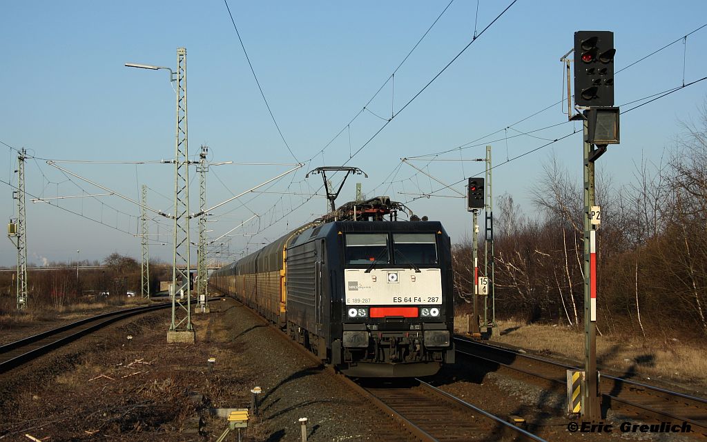 ES64F4-287 mit einem Altmann-Autozug am 02.02.2012 in Weetzen.