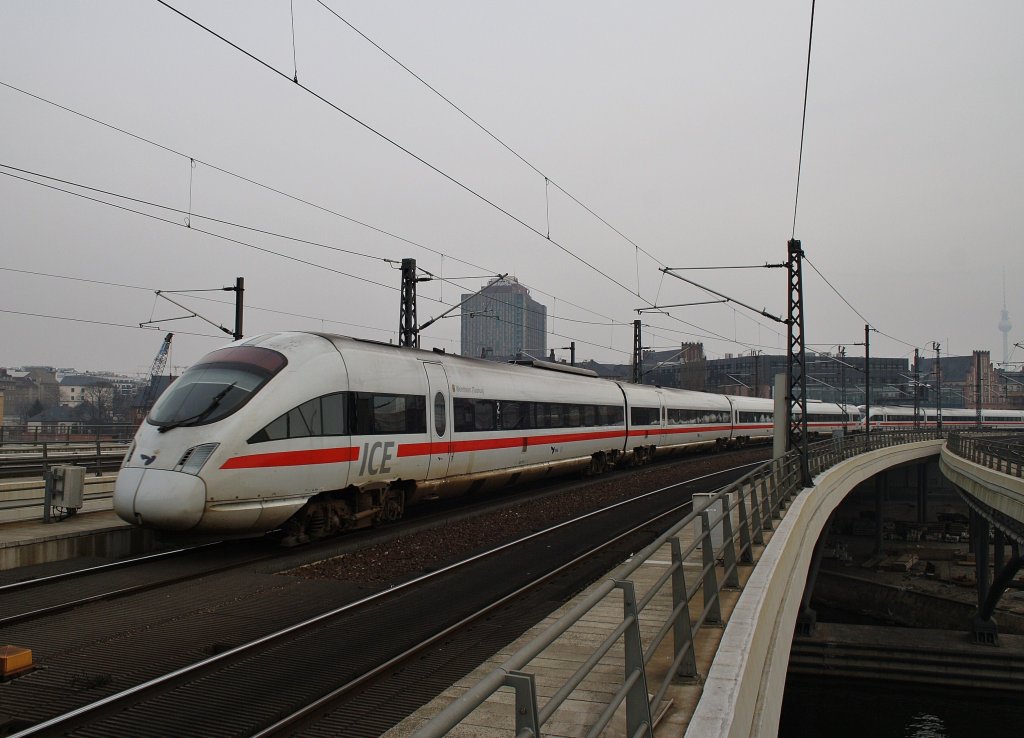 Hier 605 505-8 "Ostseebad Heringsdorf" als ICE35 von Berlin Ostbahnhof nach Koebenhavn H und 605 010-8 "Wehrheim(Taunus)" als ICE380 von Berlin Ostbahnhof nach Aarhus H, bei der Einfahrt am 28.1.2012 in Berlin Hbf.