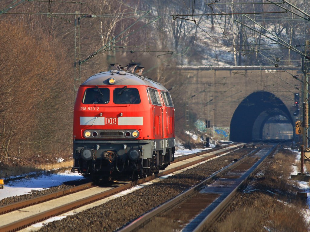 ICE-Abschlepplok Tandem 218 833-2 und 218 813-4 am 04.02.2012 auf der KBS 480 bei Eilendorf auf dem Weg Richtung Aachen.