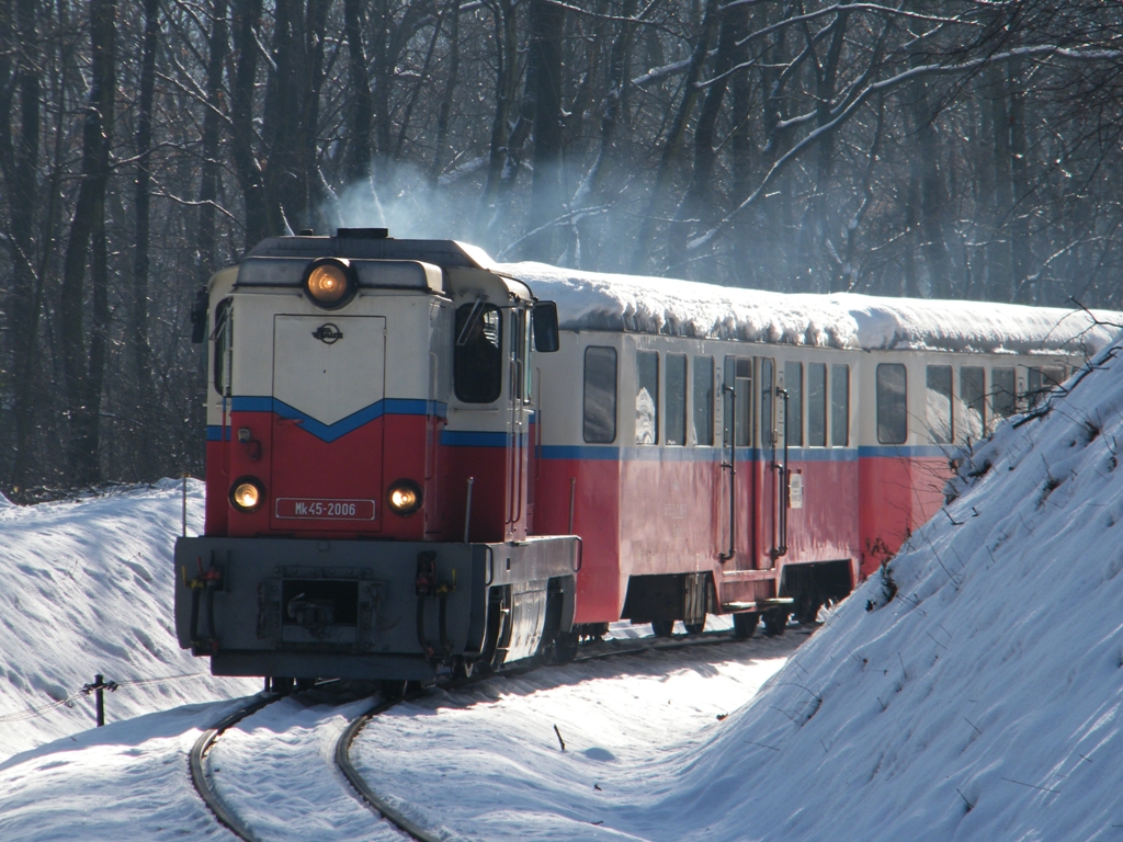 Mk45 2006 kommt am Bahnhof Hűvösvölgy an, am Schmalspurbahn 'Széchenyi-hegyi Gyermekvasút', am 05. 12. 2010.