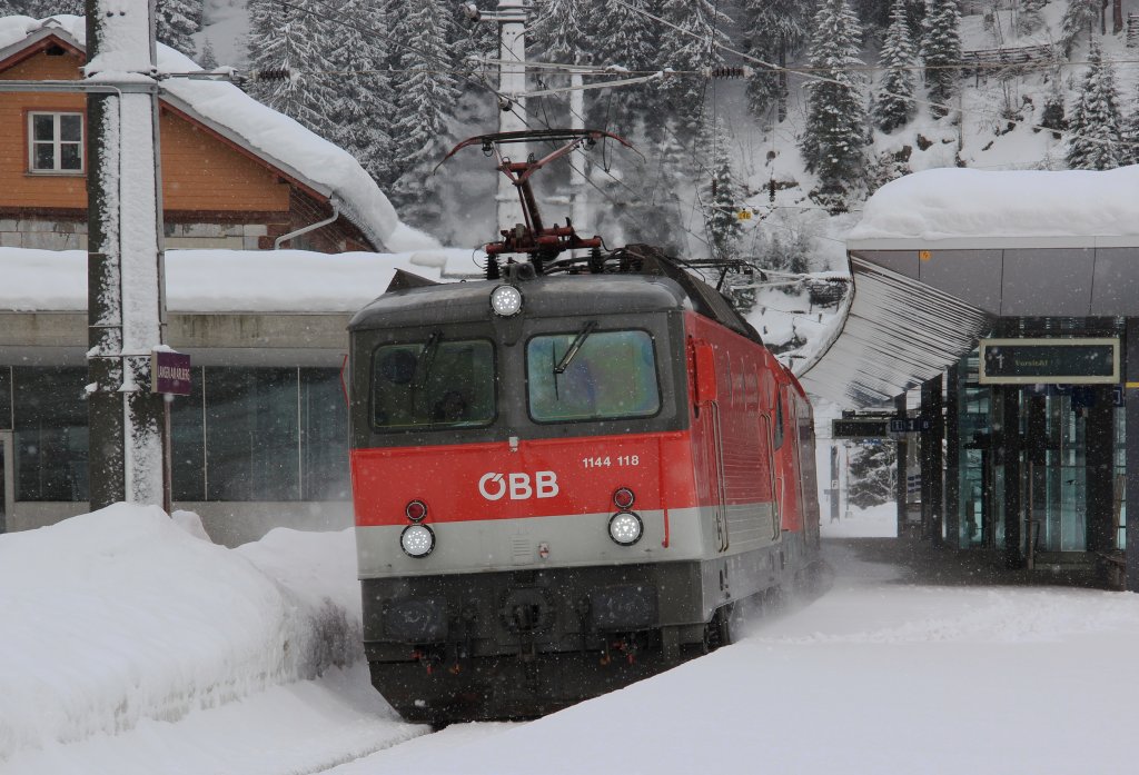 ÖBB 1144 118 und eine 1116 fahren am 04.01.12 mit einem gemischten Güterzug über den Arlberg aufgenommen in Langen am Arlberg.