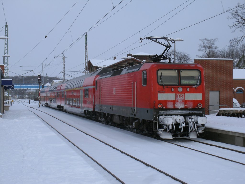 Seit ein paar Tagen schon ist 112 133 auf Rügen im Einsatz.So auch am 02.Februar 2012 als Sie den RE 13011 Rostock-Sassnitz aus Bergen/Rügen schob.
