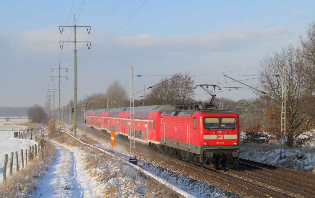 Hier links 112 120-1 mit einem RE1 von Magdeburg Hbf. nach Frankfurt(Oder) und rechts 401 002-1 "Flensburg" als ICE695 von Berlin Ostbahnhof nach Stuttgart Hbf., diese beiden Züge begegneten sich am 28.1.2012 in Berlin Hbf.
