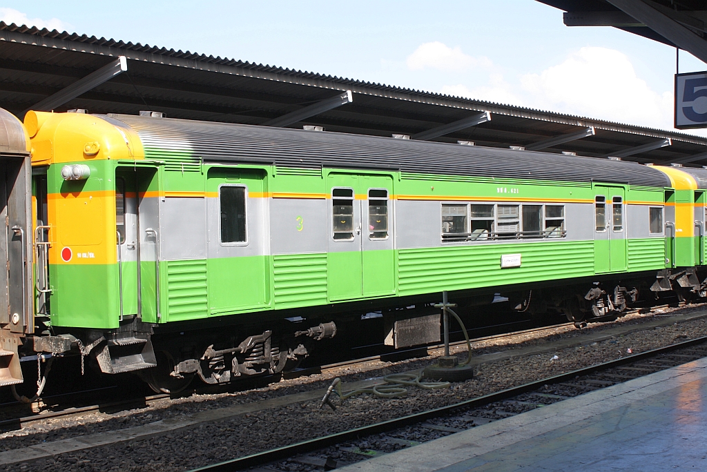 บชส. 613 (บชส = BTC/Bogie Third Class Carriage) im neuen Design am 29.Oktober 2011 auf Gleis 6 des Bf. Hua Lamphong.