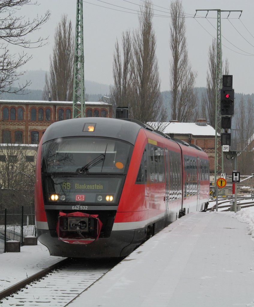 642 532 erreicht am 04. Februar 2012 als Regionalbahn von Arnstadt über Saalfeld (Saale) nach Blankenstein den Saalfelder Bahnhof auf Gleis 1.