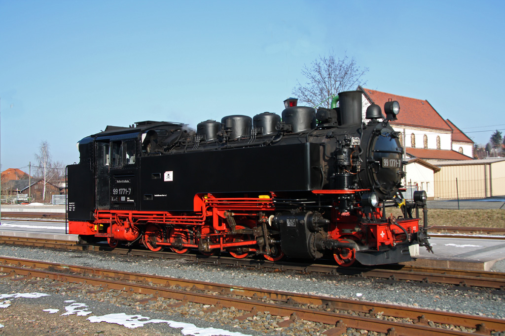 An einem kalten Februartag des Jahres 2012 erreicht 99 1771-7 mit ihrem Personenzug Freital-Coßmannsdorf.