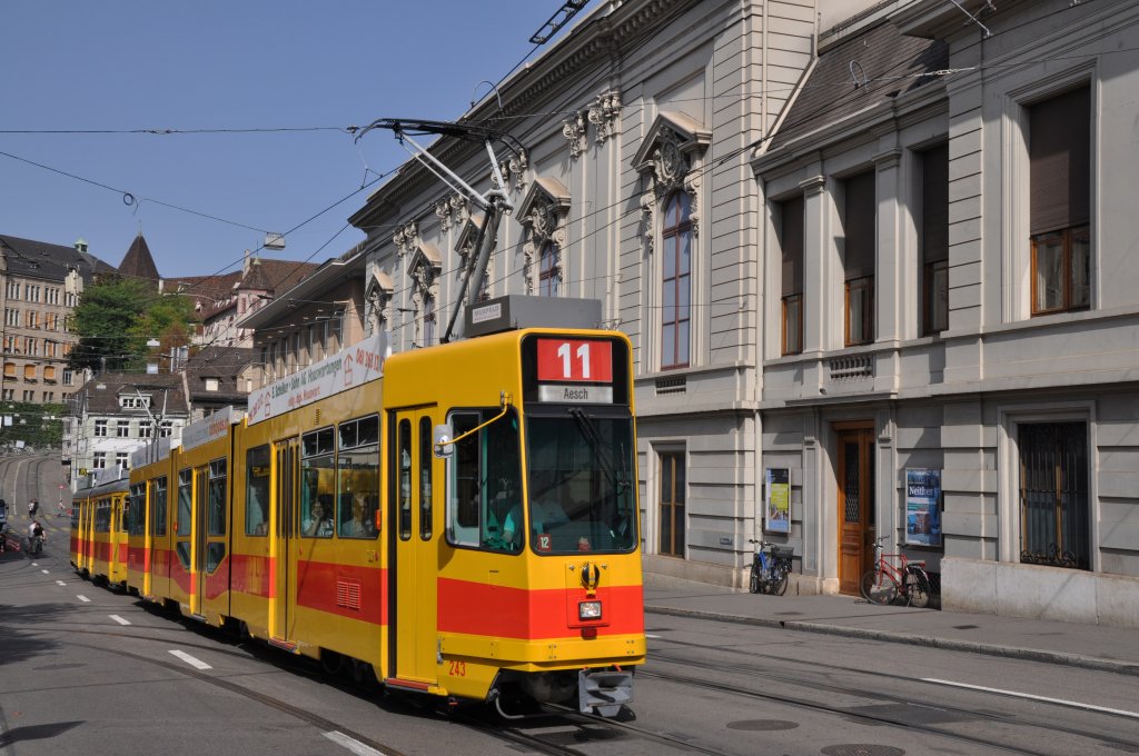 Be 4/8 mit der Betriebsnummer 243 und der Be 4/6 135 auf der Linie 11 fahren den Steinenberg hinauf zur Haltestelle Bankverein. Die Aufnahme stammt vom 22.08.2011.
