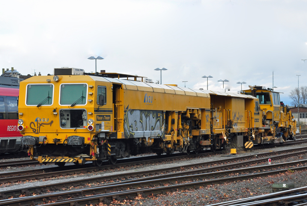 Gleisstopf- und Schotterplaniermaschine der DGU (Deutsche Gleisbau Union) im Bf Euskirchen - 03.12.2011