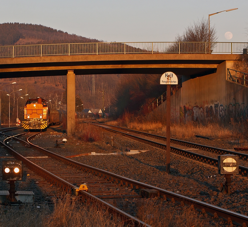 Im letzen Sonnenlicht und bei Vollmond: In Herdorf (06.02.2012) auf der Gleisanlage der Kreisbahn Siegen-Wittgenstein  (KSW) ist die Lok 42, eine Vossloh G 1700 BB (F.-Nr. 1001108, Baujahr 2001) mit Güterzug bereit zur Übergabefahrt nach Betzdorf/Sieg. Die Gleissperre ist noch geschlossen. Rechts verläuft das DB-Gleis (KBS 462) Hellertalbahn.