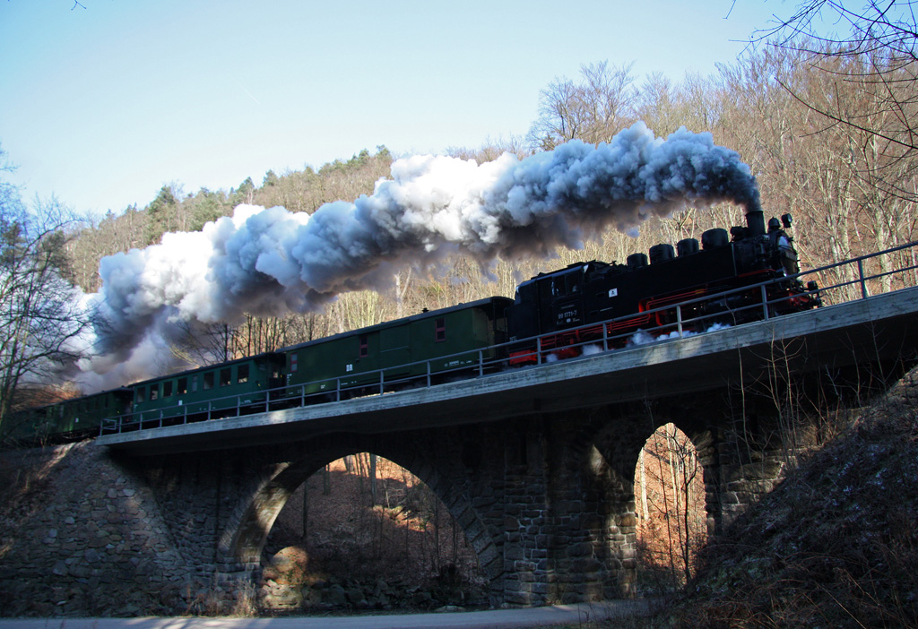 Wenige Minuten hinter Coßmannsdorf beginnt der romantische Rabenauer Grund. An diesem Tag hatte 99 1771-7 den Altbauzug am Haken. Leider steht im Februar die Sonne auch mittags nicht hoch genug um auch die Brücke mit zu erhellen.