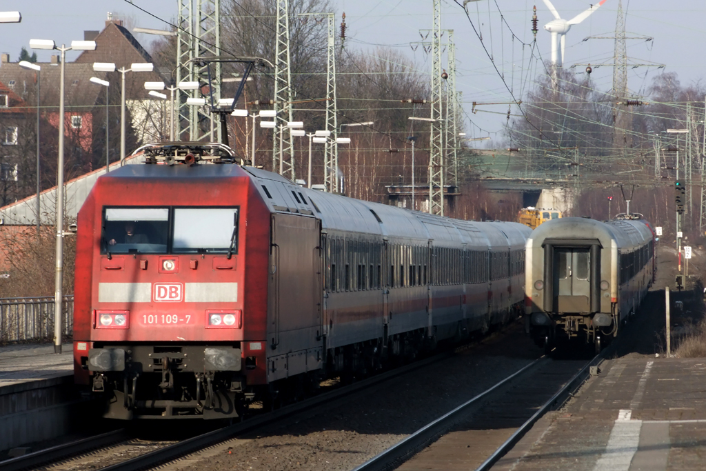 101 109-7 mit IC132 nach Luxemburg bei der Einfahrt in Recklinghausen,mit im Bild der Ausfahrende IC135 nach Norddeich Mole 8.2.2012