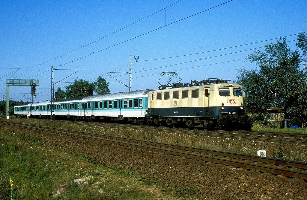 01 514 mit D 371 "Pannonia-Express" nach der Abfahrt aus dem Bahnhof Doberlug-Kirchhain, 1974