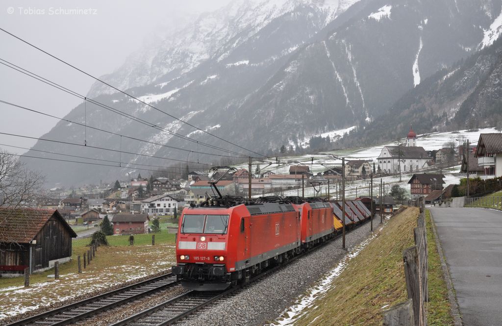 185 127 + 185 092 mit Güterzug am 07.01.2012 bei Silenen