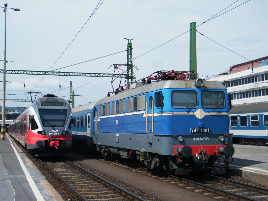 5341 019-7 (Stadler Flirt), V43 1001 warten am Hauptbahnhof Budapest-Déli, am 30. 04. 2011.