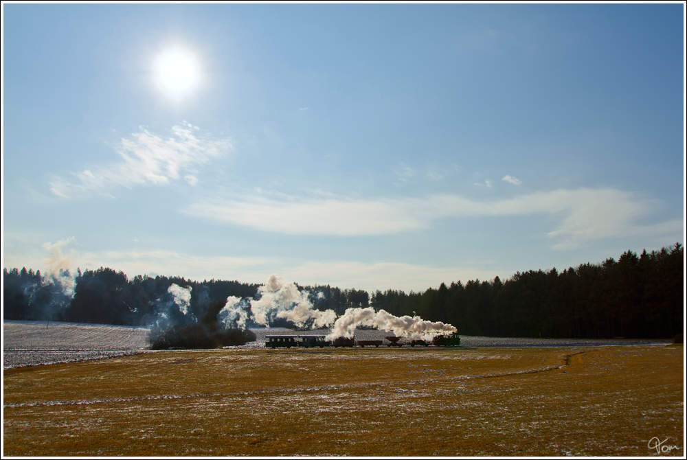 Für eine kleine Gruppe aus England gab es dieser Tage Winterdampf in der Steiermark. Hier sieht man die dienstälteste Dampflok der Welt, die 671 der Gkb mit dem SPZ 8519 auf der Fahrt von Graz Köflacherbahnhof nach Wies Eibiswald. Hollenegg 5.2.2012