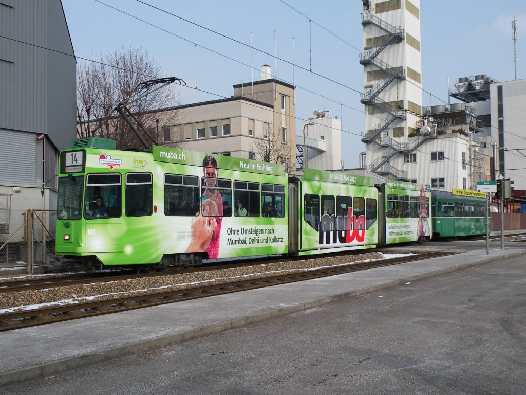 Be 4/6S mit der Betriebsnummer 661 und der MUBA Vollwerbung hat die Haltestelle Kästeli verlassen und fährt Richtung Haltestelle Lachmatt. Die Aufnahme stammt vom 08.02.2012.