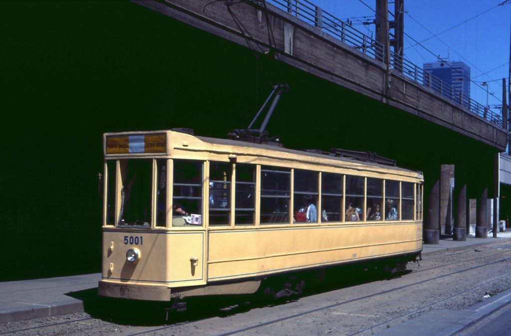 Brüssel Museums-Tw 5001 auf seiner sonntäglichen Runde in der Fonsny Laan unterhalb der Stadtbahn beim Bahnhof Midi, 18.06.2000.