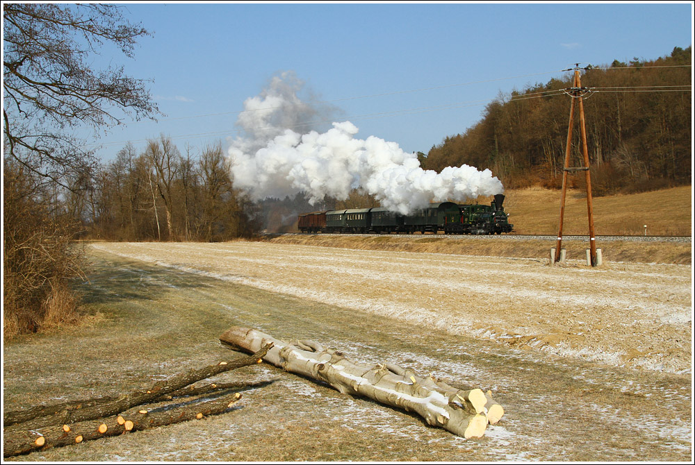 Für eine kleine Gruppe aus England gab es dieser Tage Winterdampf in der Steiermark. Hier sieht man die dienstälteste Dampflok der Welt, die 671 der Gkb mit dem SPZ 8519 auf der Fahrt von Graz Köflacherbahnhof nach Wies Eibiswald.  Groß St. Florian 5.2.2012