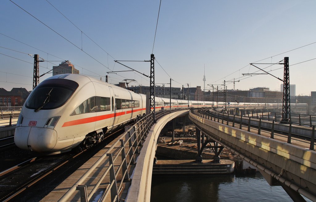 Hier 411 851-5  Elsterwerda  als ICE1533 von Köln Hbf. nach Berlin Ostbahnhof mit 411 062-3  Vaihingen an der Enz  als ICE1543 von Köln Hbf. nach Berlin Ostbahnhof, bei der Ausfahrt am 30.1.2012 aus Berlin Hbf.