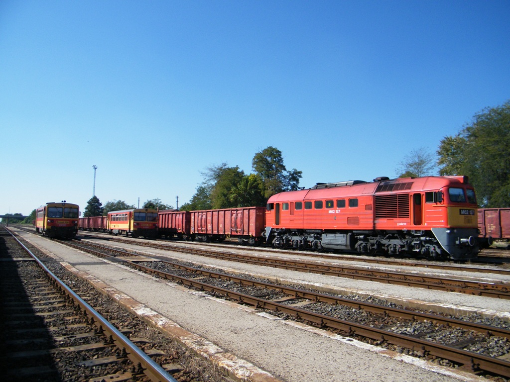 MÁV-Trakció M62 127 wartet mit einem Güterzug nach Békéscsaba am Bahnhof Orosháza, am 01. 10. 2011. Daneben stehen zwei Bzmots.
