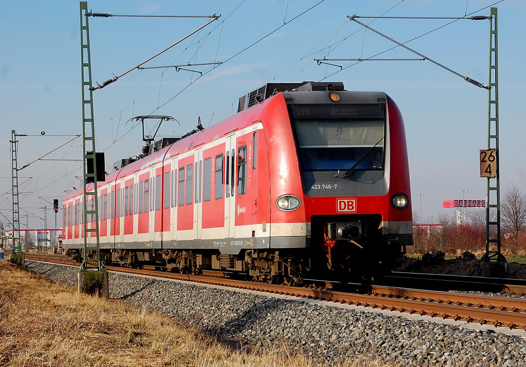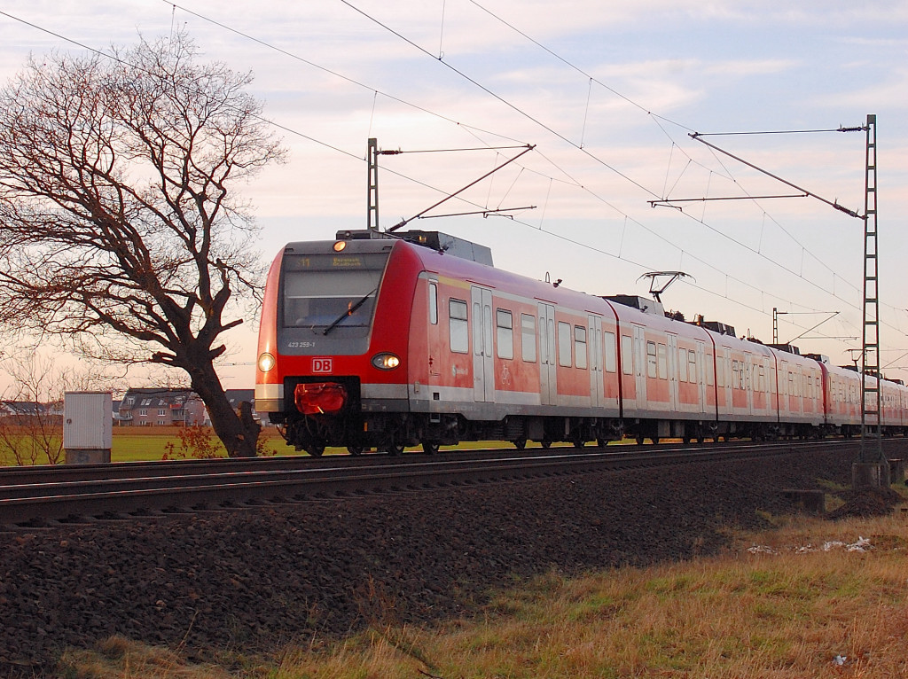 Triebwagen 423 259-1 ist an diesem Abend auf der S11 nach Bergisch Gladbach mit einem unbekannten Anhang unterwegs. 27.1.2012