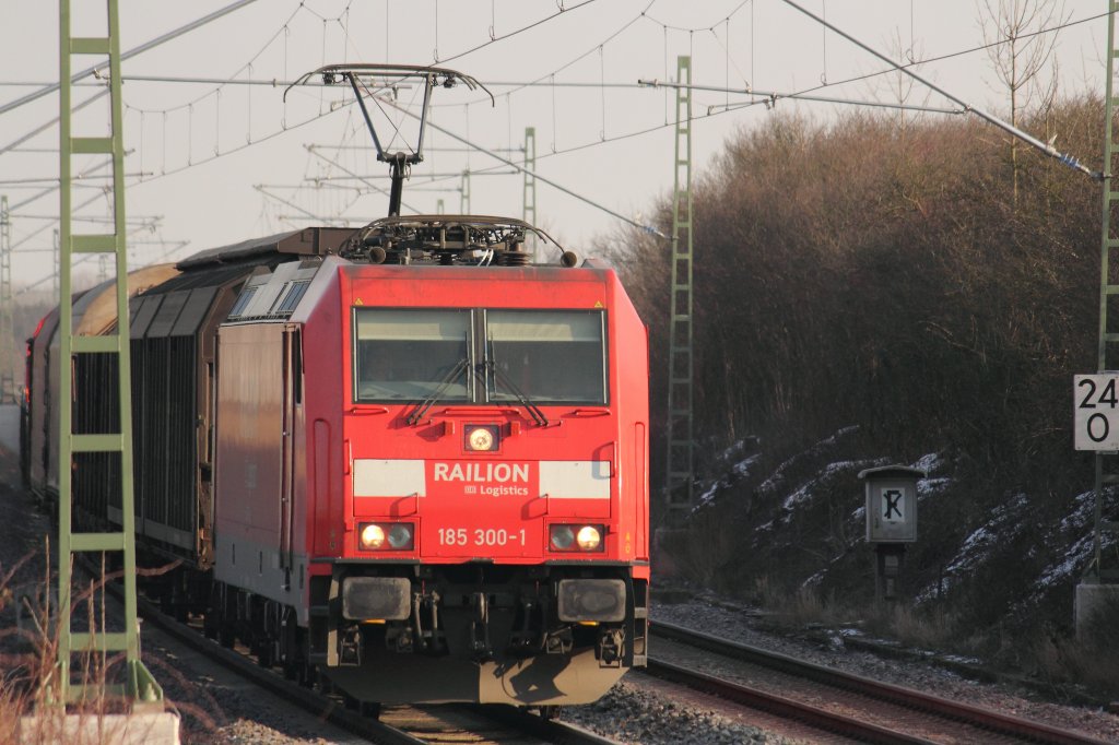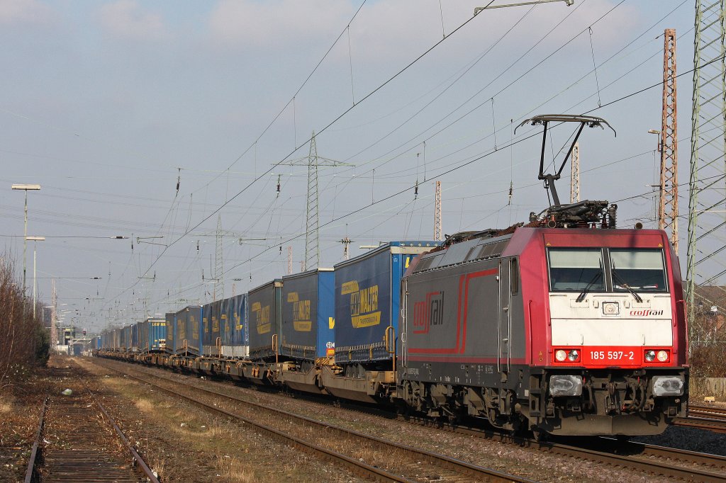 Die Crossrail 185 597 zieht am 4.2.12 einen LKW-Walther von Duisburg-Ruhrort Hafen nach Domodossola durch Ratingen-Lintorf.