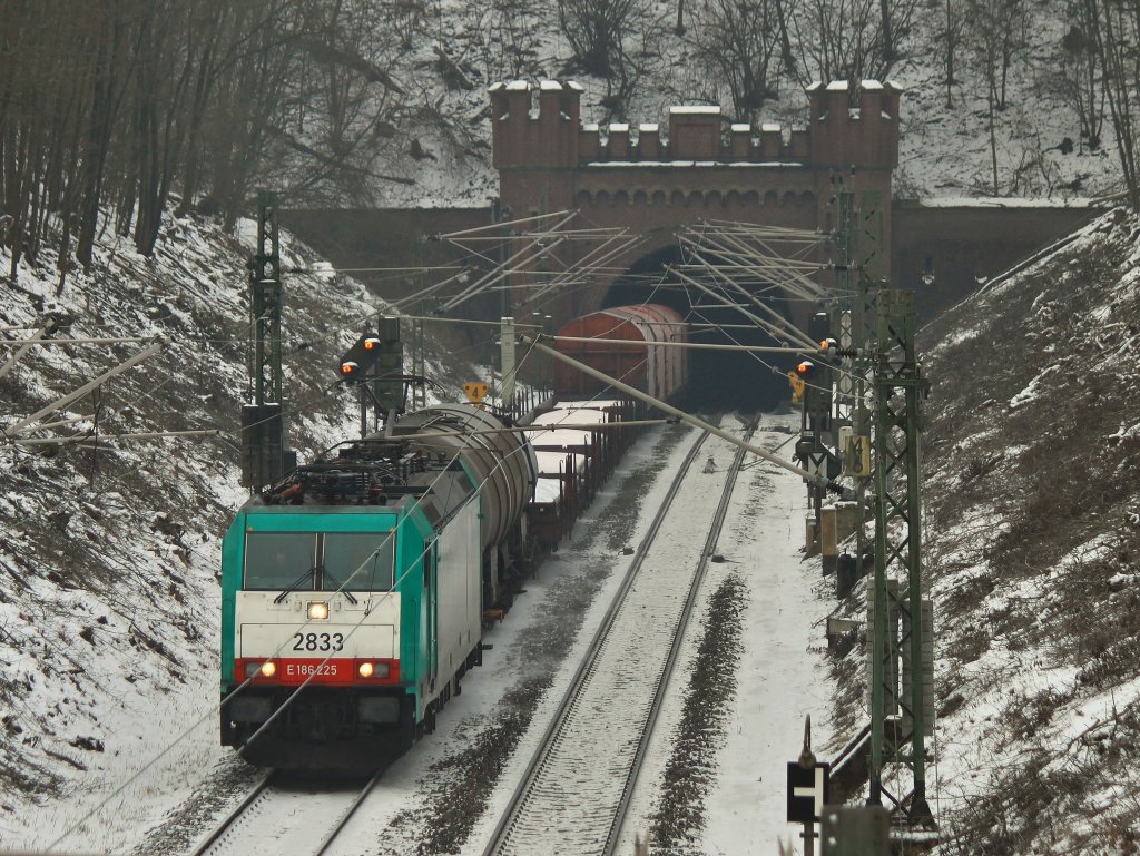 Ab hier geht es nur noch berab bis Aachen West. Mit einem gemischten Güterzug am Haken verläßt Cobra 186 225 (2833) am 09.02.2012 den 870 m langen Gemmenicher Tunnel. Der Grenztunnel wurde 1872 gebaut und verbindet Aachen West mit Montzen und den Seehäfen in Belgien. Die Staatsgrenze zwischen Deutschland und Belgien verläuft im Tunnel, ca.500m liegen auf Deutschen Gebiet. Die Pflege und Wartung des Tunnels liegt jedoch komplett bei der DB.