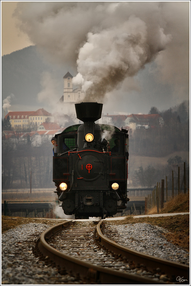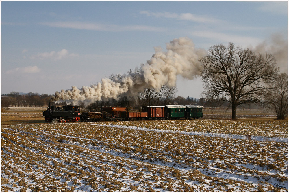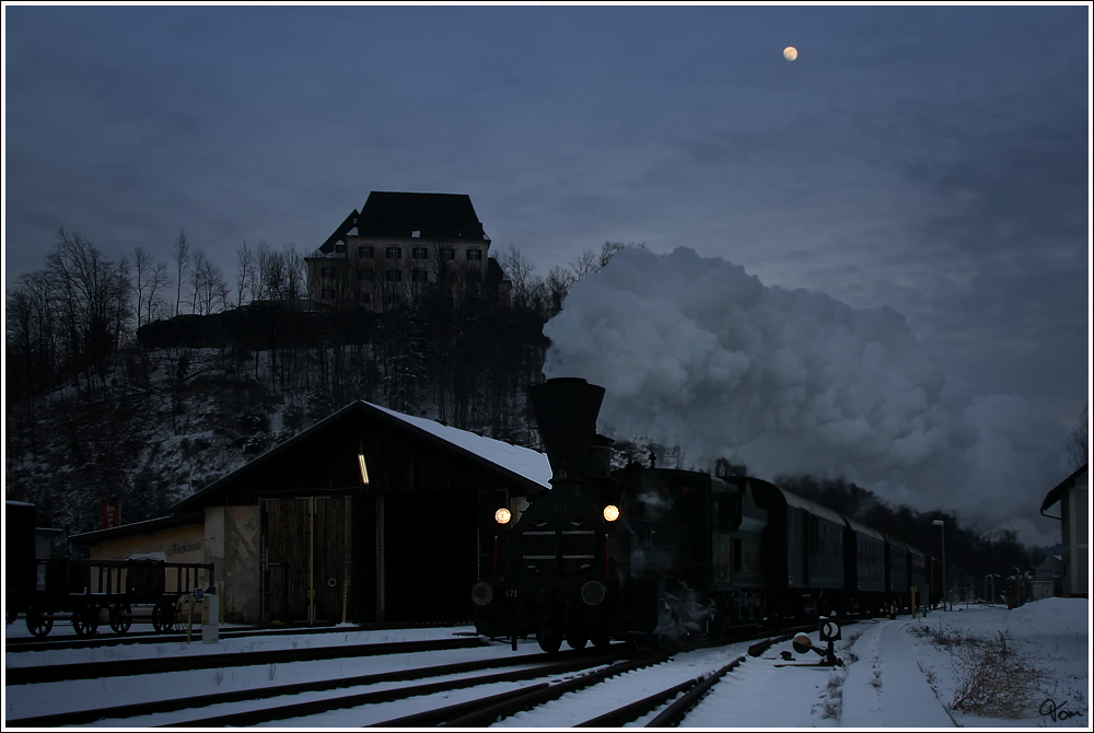 Für eine kleine Gruppe aus England gab es dieser Tage Winterdampf in der Steiermark. Hier sieht man die dienstälteste Dampflok der Welt, die 671 der Gkb mit dem SPZ 8519 auf der Fahrt von Graz Köflacherbahnhof nach Wies Eibiswald. Pirka 5.2.2012