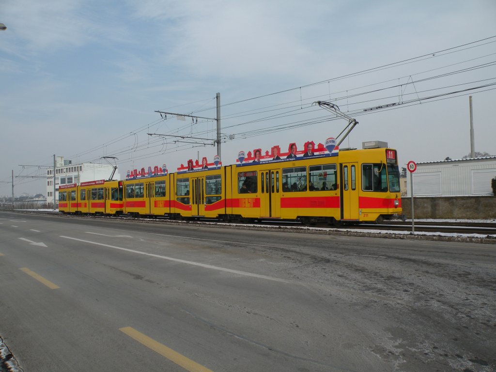 Be 4/8 mit der Betriebsnummer 211 und der Be 4/6 229 auf der Linie 11 fahren Richtung Haltestelle M-Parc. Die Aufnahme stammt vom 09.02.2012.