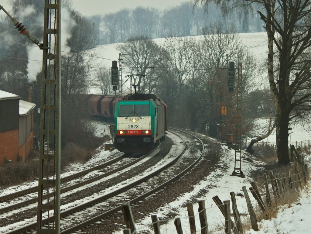 Bei saukalten Temperaturen zieht Cobra 186 215 (2823) am 09.02.2012 einen Getreidezug durch die letzte Kurve der Montzenrampe vor dem Gemmenicher Tunnel von Aachen West nach Belgien. Die Schienen scheinen sehr schmierig zu sein, man kann das Schleudern der Lok hören.