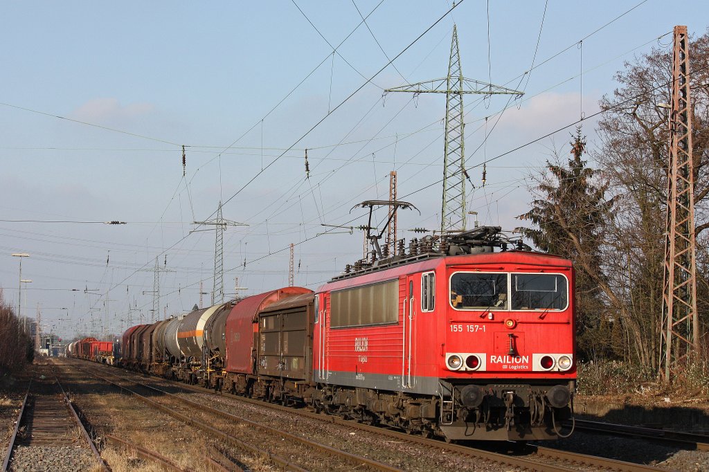 Die 155 157 am 4.2.12 mit einem gemischten Güterzug beim warten aus Weiterfahrt in Ratingen-Lintorf.