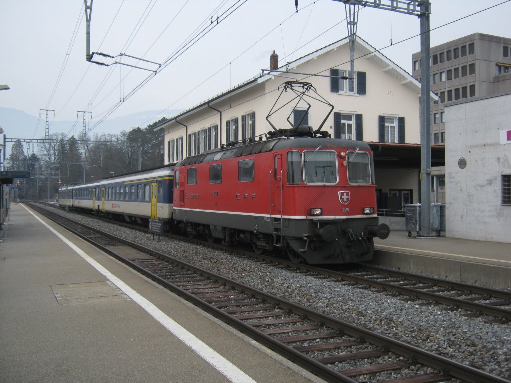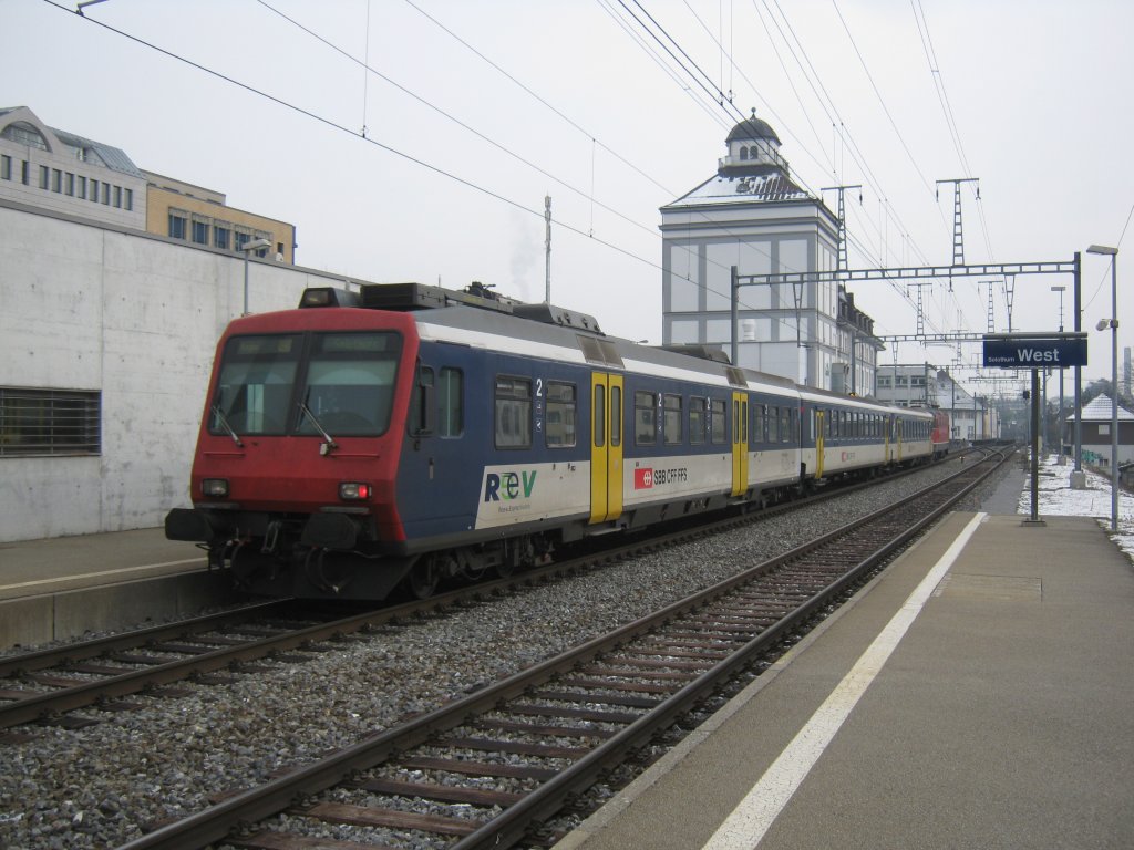 Ersatz Regio 7153 bestehend aus einem NPZ mit einer Re 4/4 II, 11139, statt einem RBDe. Am Zugschluss war ist ein NPZ Bt mit dem REV-Logo, Solothurn West, 09.02.2012.